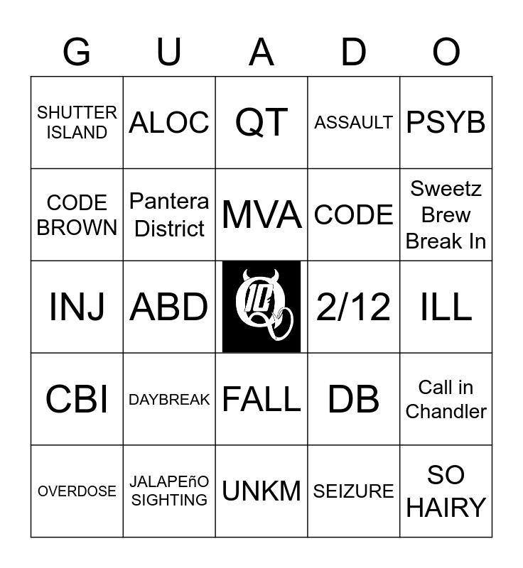 This bingo card has a free space and 25 words: DAYBREAK, UNKM, MVA, OVERDOSE, PSYB, SHUTTER ISLAND, CODE BROWN, ALOC, 2/12, FALL, CODE, INJ, DB, Call in Chandler, Pantera District, STAGED, ILL, QT, Sweetz Brew Break In, ABD, SO HAIRY, JALAPEñO SIGHTING, CBI, ASSAULT and SEIZURE.