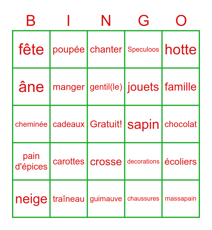 This bingo card has a free space and 29 words: neige, St. Nicolas, cadeaux, enfants, fête, chanter, manger, carottes, sapin, traîneau, chocolat, massapain, guimauve, chaussures, famille, mitre, crosse, pain d'épices, hotte, cheminée, decorations, bonbons, jouets, âne, Speculoos, poupée, écoliers, gentil(le) and sage.