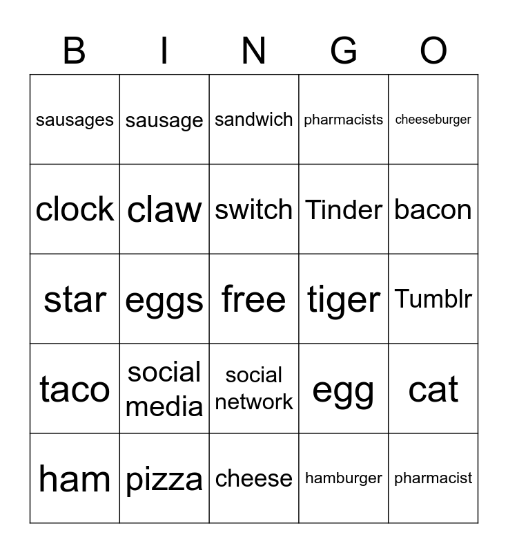 This bingo card has 25 words: taco, pizza, free, hamburger, cheeseburger, sausages, sausage, sandwich, tiger, cat, clock, claw, cheese, egg, bacon, ham, eggs, switch, Tinder, Tumblr, star, social media, social network, pharmacists and pharmacist.