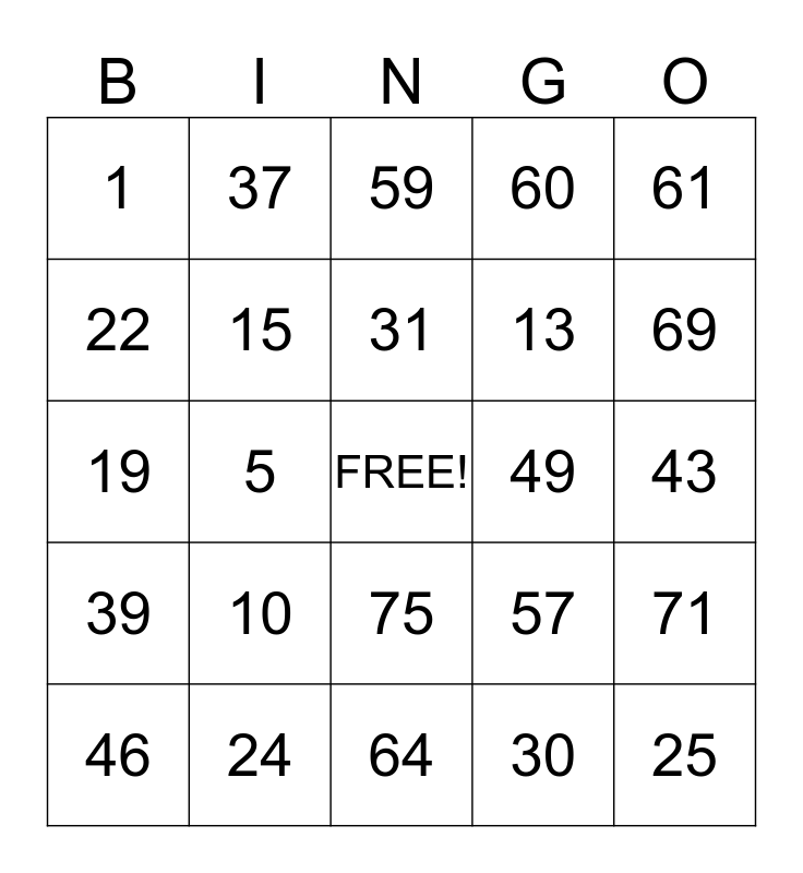 This bingo card has a free space and 24 words: 10, 24, 31, 46, 61, 1, 22, 37, 49, 75, 13, 19, 57, 71, 15, 30, 43, 59, 69, 5, 25, 39, 60 and 64.