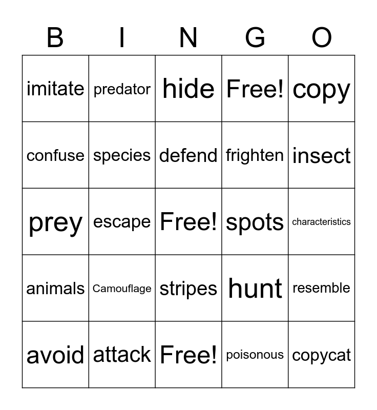 This bingo card has a free space and 24 words: Camouflage, attack, defend, avoid, copy, imitate, confuse, predator, spots, stripes, frighten, prey, hunt, resemble, species, poisonous, characteristics, hide, insect, escape, copycat, animals, Free! and Free!.