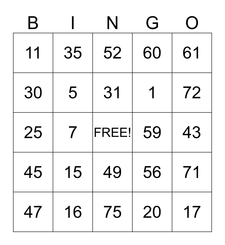 This bingo card has a free space and 24 words: 15, 16, 31, 47, 61, 11, 30, 35, 59, 49, 1, 25, 56, 71, 5, 20, 43, 52, 72, 7, 17, 45, 60 and 75.