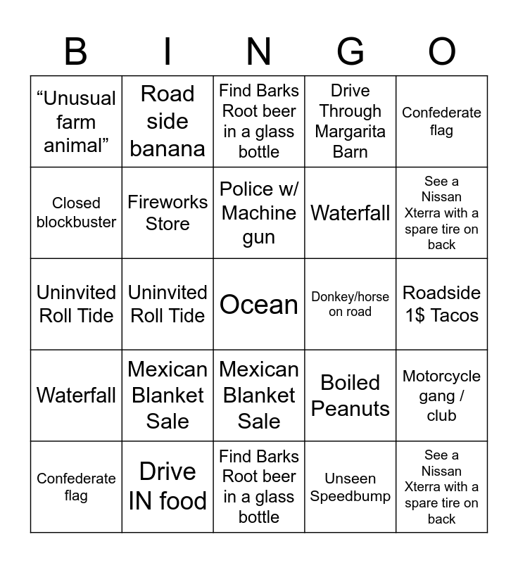 ⚠ This card has duplicate items: See a Nissan Xterra with a spare tire on back (2), “Pure unadulterated Redneck” (2), Find Barks Root beer in a glass bottle (2), Mexican Blanket Sale (2), Under a 1/8th of a tank of gas (2), Road side banana (2), Bible verse on road sign (2), Closed blockbuster (2), Drive IN food (2), Fireworks Store (2), Drive Through Margarita Barn (2), Motorcycle gang / club (2), Boiled Peanuts (2), Roadside 1$ Tacos (2), “Divided house” college sticker (2), Police w/ Machine gun (2), Donkey/horse on road (2), “XXX Next Exit” (2), Confederate flag (2), Uninvited Roll Tide (2), Unseen Speedbump (2), “Unusual farm animal” (2), Waterfall (2), Ocean (2)