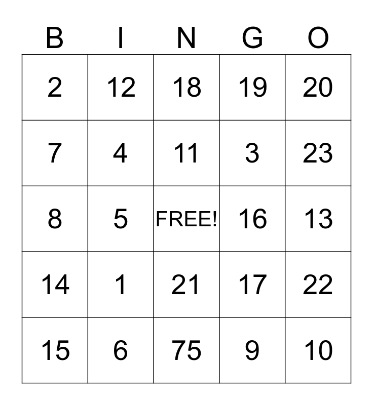 This bingo card has a free space and 24 words: 1, 6, 11, 15, 20, 2, 7, 12, 16, 21, 3, 8, 17, 22, 4, 9, 13, 18, 23, 5, 10, 14, 19 and 75.