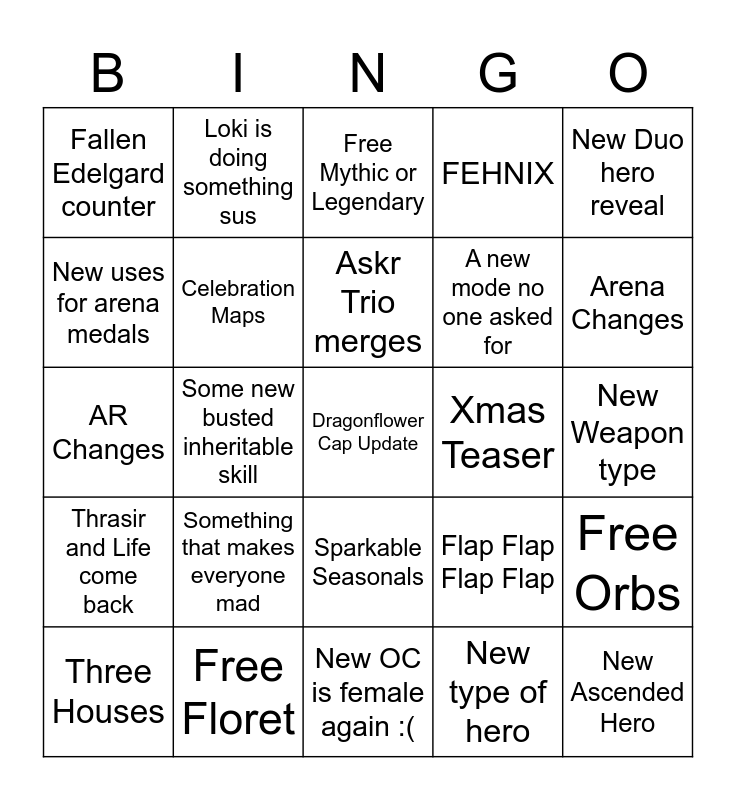 This bingo card has 25 words: Something that makes everyone mad, New OC is female again :(, Askr Trio merges, Three Houses, New Duo hero reveal, Fallen Edelgard counter, New uses for arena medals, Loki is doing something sus, Xmas Teaser, Sparkable Seasonals, A new mode no one asked for, AR Changes, Flap Flap Flap Flap, Free Orbs, Celebration Maps, New Ascended Hero, New Weapon type, Free Mythic or Legendary, Arena Changes, Some new busted inheritable skill, Dragonflower Cap Update, Free Floret, Thrasir and Life come back, FEHNIX and New type of hero.