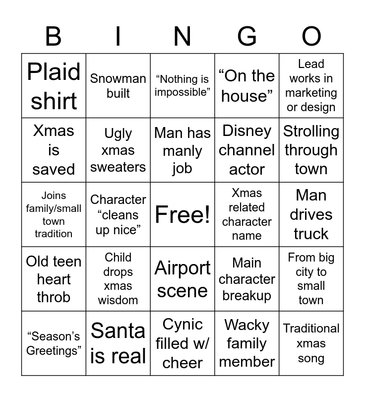 This bingo card has a free space and 58 words: Love Triangle, Santa is real, Bad original song, Old teen heart throb, Wacky family member, Tree decorating, Ugly xmas sweaters, “Christmas Miracle”, Disney channel actor, Coffee shop or bar, “On the house”, Fake country, Alt timeline/xmas reality, Bad/generic accent, Snows on xmas, Plaid shirt, Traditional xmas song, Lead works in marketing or design, Interrupted almost kiss, Man has manly job, Xmas related character name, “Nothing is impossible”, “Season’s Greetings”, From big city to small town, Childhood friends fall in love, Man drives truck, Pet dog, Snowed in, Strolling through town, Minority on screen, Sheriff or Dr appears, Deal made w/ Santa/angel, Childhood flashback, Ice skating, Main character falls in love, Xmas lights magically turn on, Dead relative referenced, Character “cleans up nice”, Joins family/small town tradition, Character falls down, Child drops xmas wisdom, Mysterious xmas being, Main character breakup, Drink eggnog, cider, hot choc, Characters “bump” into each other, Xmas fair or market, Food removed from oven, Airport scene, Cynic filled w/ cheer, Mistletoe, Xmas singing, Element of xmas almost ruined, Struggling business/entity saved, Snowball fight, Snowman built, Contest, Xmas is saved and Actor from Mean Girls.