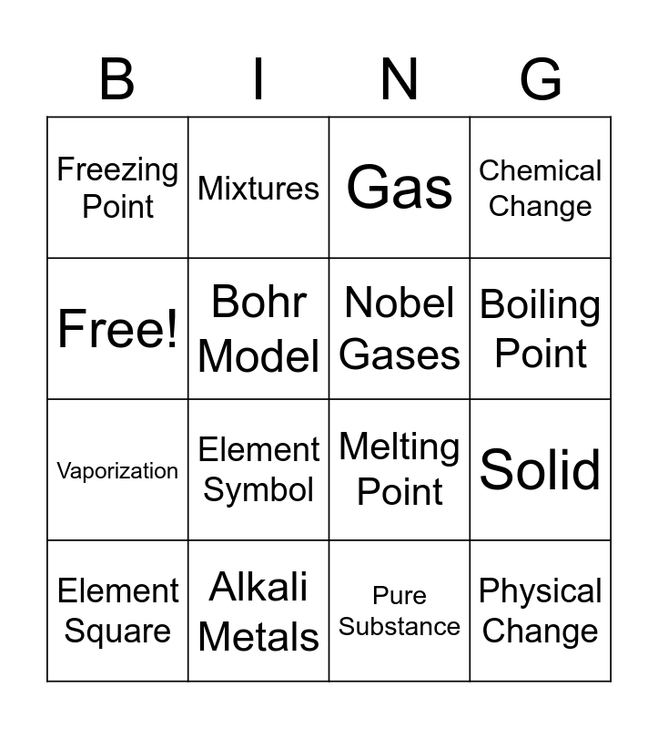 This bingo card has 16 words: Alkali Metals, Solid, Gas, Freezing Point, Vaporization, Mixtures, Melting Point, Pure Substance, Free!, Bohr Model, Element Square, Chemical Change, Element Symbol, Boiling Point, Nobel Gases and Physical Change.