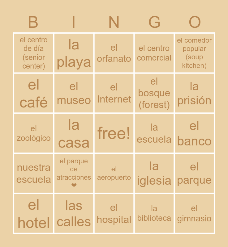 This bingo card has a free space and 24 words: el parque de atracciones ❤, las calles, el Internet, el hotel, el comedor popular (soup kitchen), el centro de día (senior center), el café, la playa, la escuela, el aeropuerto, el bosque (forest), el zoológico, la iglesia, el parque, el museo, la biblioteca, el banco, el orfanato, la prisión, la casa, el gimnasio, nuestra escuela, el centro comercial and el hospital.