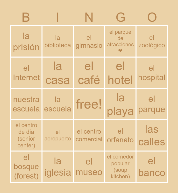 This bingo card has a free space and 24 words: el aeropuerto, la iglesia, el café, el bosque (forest), el zoológico, la prisión, el Internet, la biblioteca, la playa, el centro comercial, el hotel, nuestra escuela, el orfanato, las calles, la casa, el comedor popular (soup kitchen), el parque, el gimnasio, el hospital, la escuela, el banco, el centro de día (senior center), el parque de atracciones ❤ and el museo.