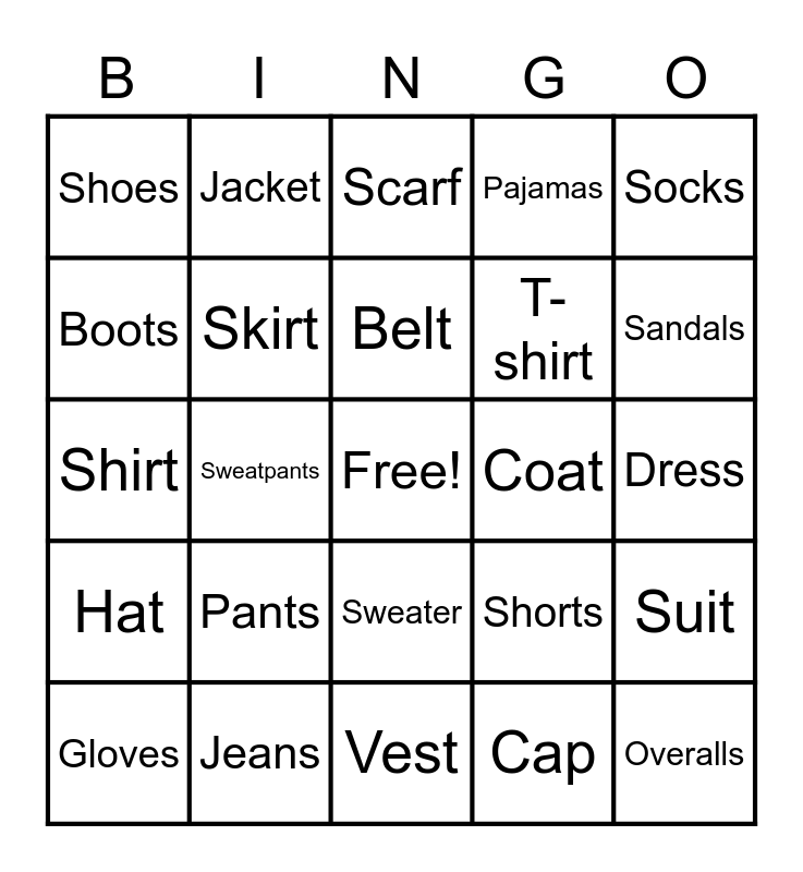 This bingo card has a free space and 24 words: Pants, Jeans, Belt, Gloves, Socks, Shoes, Boots, Jacket, Coat, Sweater, T-shirt, Shirt, Shorts, Suit, Skirt, Cap, Dress, Scarf, Sandals, Sweatpants, Overalls, Hat, Pajamas and Vest.