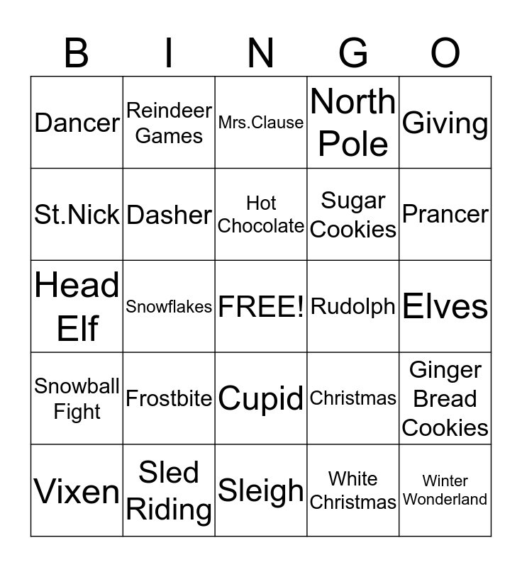 This bingo card has a free space and 24 words: Frostbite, Sled Riding, Hot Chocolate, Vixen, Giving, Dancer, St.Nick, Reindeer Games, Rudolph, Cupid, Sugar Cookies, Head Elf, Christmas, Ginger Bread Cookies, Dasher, White Christmas, Elves, Mrs.Clause, Prancer, Snowflakes, Winter Wonderland, Snowball Fight, North Pole and Sleigh.