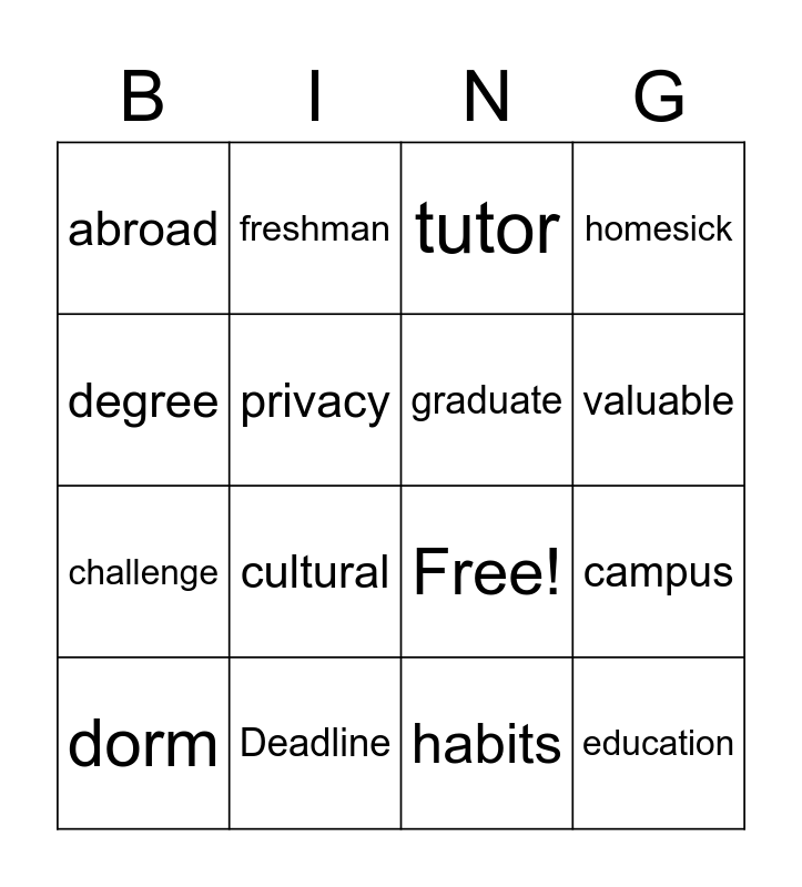 This bingo card has 21 words: Deadline, schedule, freshman, manage, habits, graduate, abroad, tutor, Free!, valuable, challenge, homesick, education, community, privacy, lifestyle, dorm, cultural, degree, campus and participate.