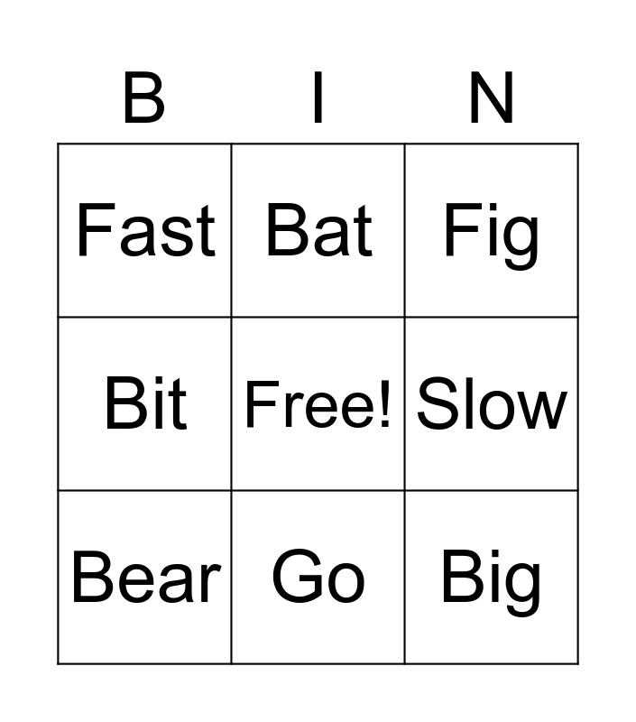 This bingo card has a free space and 13 words: Bee, Bus, Bear, Bat, Bit, Big, Bug, Bin, Go, Fast, Slow, Fig and Nap.