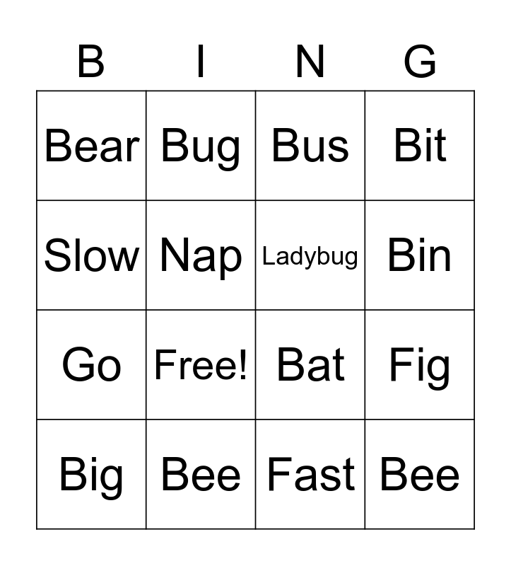 This bingo card has 18 words: Free!, Bee, Bus, Bear, Bat, Bit, Big, Bug, Bin, Go, Fast, Slow, Fig, Nap, Ladybug, Caterpillar, Bee and Butterfly.