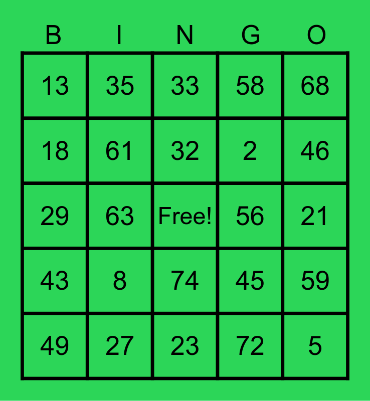This bingo card has a free space and 25 words: 8, 23, 32, 49, 68, 13, 18, 35, 56, 74, 2, 29, 45, 59, 61, 10, 21, 33, 46, 63, 5, 27, 43, 58 and 72.