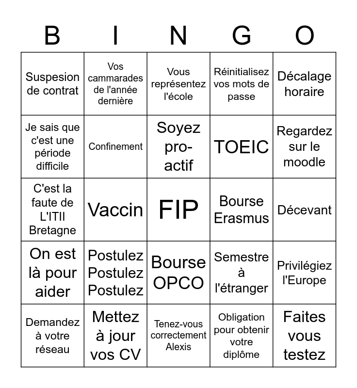This bingo card has a free space and 24 words: Postulez Postulez Postulez, Mettez à jour vos CV, Soyez pro-actif, Demandez à votre réseau, Décalage horaire, Suspesion de contrat, Je sais que c'est une période difficile, Vos cammarades de l'année dernière, Bourse Erasmus, Bourse OPCO, TOEIC, C'est la faute de L'ITII Bretagne, Semestre à l'étranger, Privilégiez l'Europe, Confinement, Obligation pour obtenir votre diplôme, Décevant, Vous représentez l'école, Regardez sur le moodle, Vaccin, Faites vous testez, On est là pour aider, Réinitialisez vos mots de passe and Tenez-vous correctement Alexis.