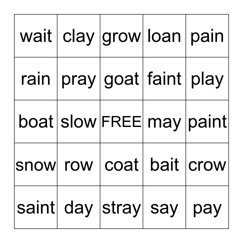 This bingo card has a free space and 24 words: row, day, goat, saint, pain, wait, rain, clay, may, coat, faint, boat, bait, crow, pray, say, paint, grow, play, slow, pay, snow, loan and stray.
