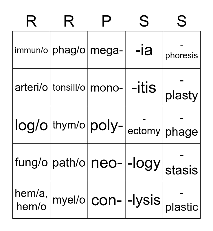 This bingo card has 80 words: adenoid/o, morph/o, mega-, -gen, -oma, agglutin/o, myel/o, meta-, -globulin, -osis, angi/o, nucle/o, mono-, -ia, -penia, arteri/o, path/o, neo-, -in, -ine, -phage, cyt/o, phag/o, poly-, -itis, -phoresis, erythr/o, phleb/o, pro-, -logist, -plasm, fung/o, ser/o, trans-, -logy, -plastic, hem/a, hem/o, splen/o, a-, an-, -lysis, -plasty, iatr/o, thromb/o, anti-, -lytic, -poiesis, immun/o, thym/o, auto-, -ation, -rrhage, kary/o, tonsill/o, con-, -blast, -sis, leuk/o, tox/o, en-, -crit, -stasis, log/o, ven/i, ven/o, epi-, -cyte, -suppression, ly/o, vir/o, macro-, -e, -therapy, lymph/o, -ectomy, -tomy, lymphaden/o, -emia, -megaly, lymphangi/o, -fusion, -phil, -philia and -pheresis.