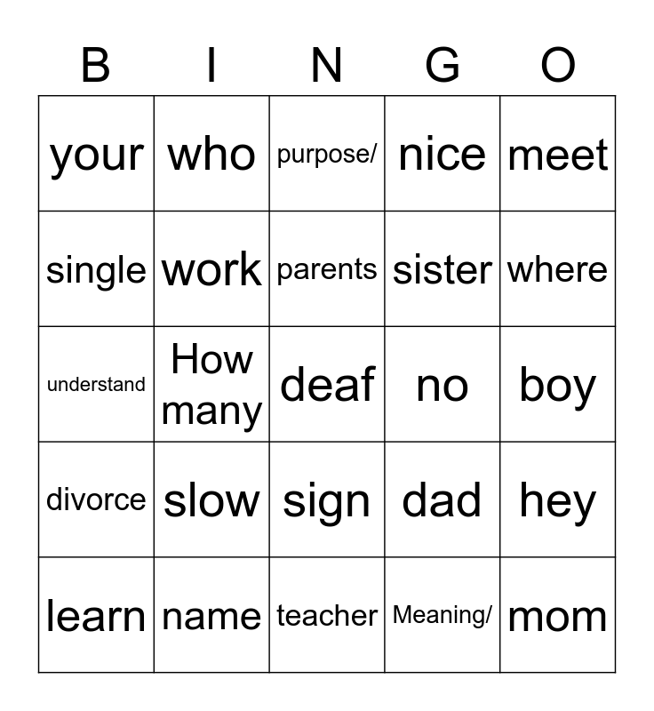 This bingo card has 43 words: again, deaf, hearing, learn, like, Meaning/, purpose/, intent, meet, name, nice, no, sign, slow, student, teacher, Thank you, understand, what, where, who, why, yes, your, girl, boy, brother, child, dad, divorce, have, hey, how, How many, Live/life/address, marriage, mom, parents, single, sister, Spell (fingerspell), work and Have (possession).