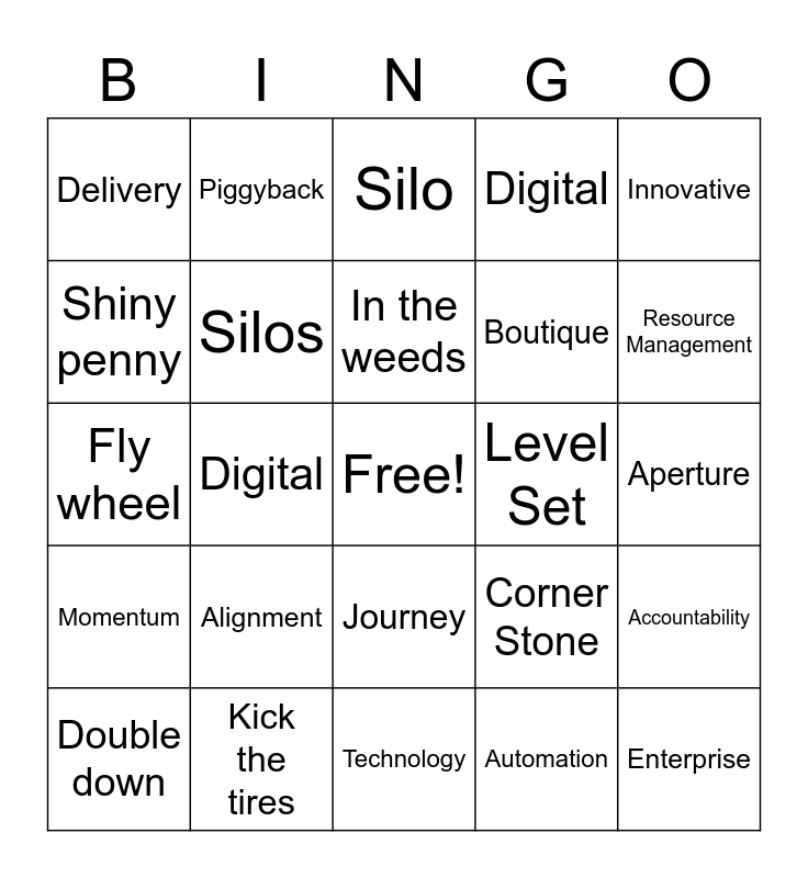 This bingo card has a free space and 24 words: Alignment, Kick the tires, In the weeds, Double down, Innovative, Delivery, Shiny penny, Piggyback, Level Set, Journey, Boutique, Fly wheel, Corner Stone, Accountability, Silos, Automation, Aperture, Silo, Resource Management, Digital, Enterprise, Momentum, Digital and Technology.