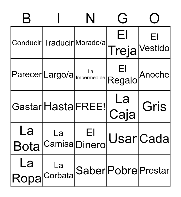 This bingo card has a free space and 24 words: La Camisa, La Corbata, La Impermeable, La Ropa, El Vestido, Conducir, Parecer, Traducir, La Caja, El Dinero, El Regalo, Gastar, Usar, Cada, Largo/a, Pobre, Gris, Morado/a, Anoche, Hasta, Prestar, La Bota, El Treja and Saber.
