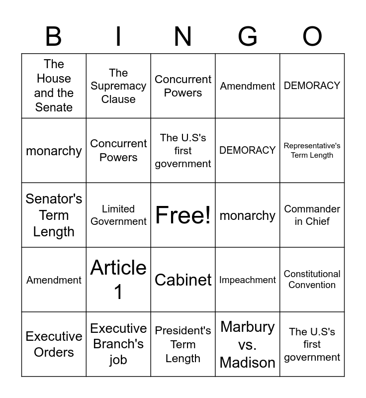 ⚠ This card has duplicate items: The U.S's first government (2), Concurrent Powers (2), DEMORACY (2), Amendment (2), monarchy (2), Population (2), The House and the Senate (2)