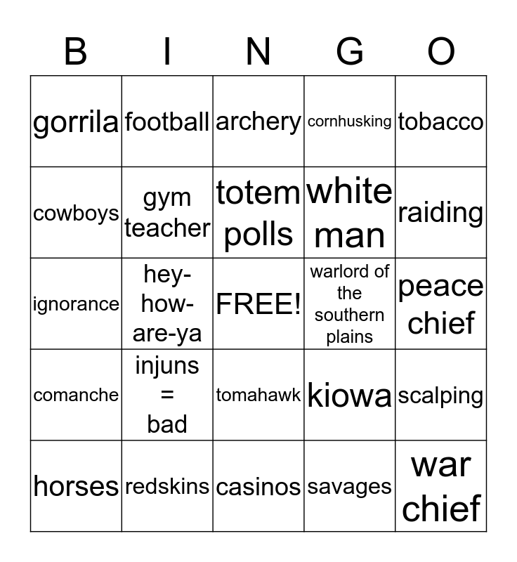This bingo card has a free space and 24 words: injuns = bad, redskins, totem polls, horses, tobacco, gorrila, cowboys, football, warlord of the southern plains, tomahawk, white man, ignorance, kiowa, scalping, gym teacher, savages, peace chief, archery, raiding, hey-how-are-ya, war chief, comanche, cornhusking and casinos.