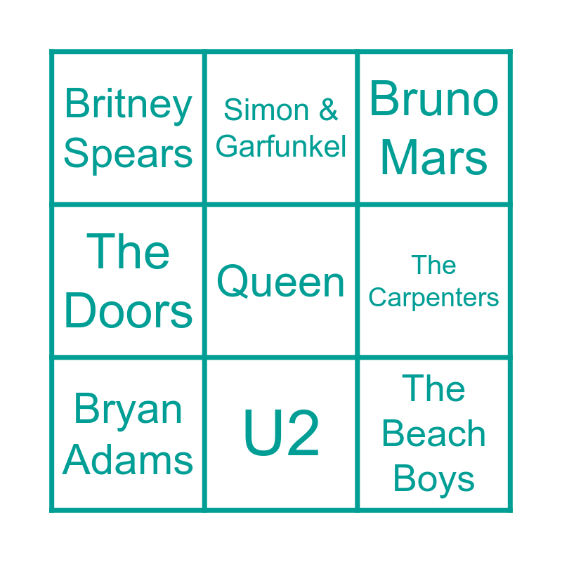 This bingo card has 30 words: ABBA, Adele, Aretha Franklin, Barbra Streisand, Britney Spears, Bruno Mars, Bryan Adams, Coldplay, David Bowie, Elton John, Elvis Presley, Eric Clapton, Guns N' Roses, Led Zepplin, Lionel Ritchie, Meatloaf, Olivia Newton John, Pink Floyd, Prince, Queen, R.E.M., Rod Stewart, Simon & Garfunkel, The Beach Boys, The Carpenters, The Doors, The Police, The Rolling Stones, U2 and Whitney Houston.