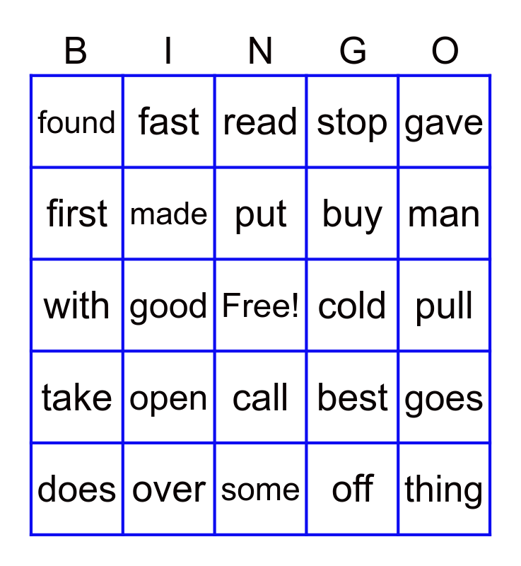 This bingo card has a free space and 24 words: open, over, put, does, gave, found, first, fast, cold, call, buy, with, best, goes, made, off, pull, read, man, good, thing, take, stop and some.