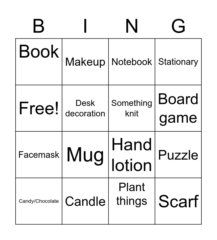 This bingo card has 16 words: Candle, Puzzle, Notebook, Book, Facemask, Makeup, Hand lotion, Plant things, Free!, Desk decoration, Candy/Chocolate, Stationary, Mug, Board game, Something knit and Scarf.