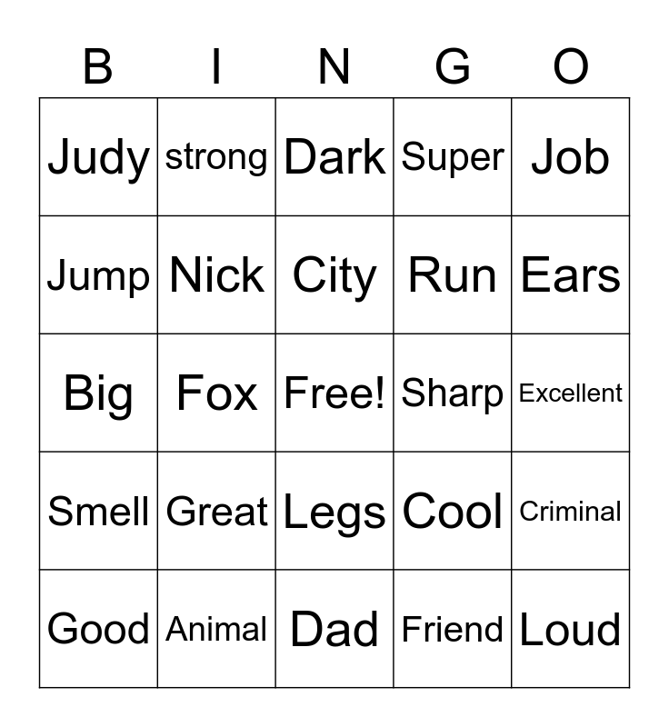 This bingo card has a free space and 24 words: Great, Animal, City, Good, Job, Judy, Jump, strong, Sharp, Legs, Run, Big, Cool, Criminal, Nick, Friend, Excellent, Dark, Ears, Fox, Loud, Smell, Super and Dad.