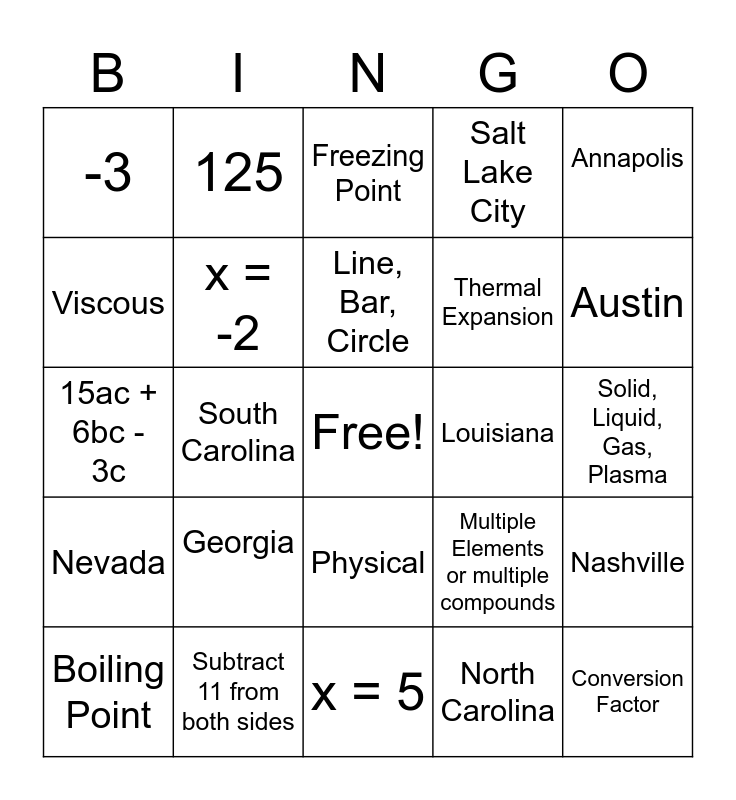This bingo card has a free space and 24 words: Georgia, Subtract 11 from both sides, Line, Bar, Circle, Boiling Point, Annapolis, -3, Viscous, 125, Louisiana, Physical, Thermal Expansion, 15ac + 6bc - 3c, Multiple Elements or multiple compounds, Nashville, x = -2, North Carolina, Solid, Liquid, Gas, Plasma, Freezing Point, Austin, South Carolina, Conversion Factor, Nevada, Salt Lake City and x = 5.