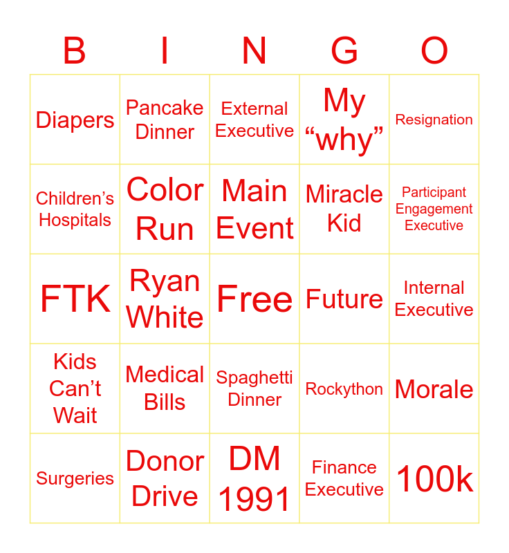This bingo card has a free space and 24 words: Medical Bills, Donor Drive, Main Event, Surgeries, Resignation, Diapers, Children’s Hospitals, Pancake Dinner, Future, Spaghetti Dinner, Miracle Kid, FTK, Rockython, Morale, Color Run, Finance Executive, Internal Executive, External Executive, Participant Engagement Executive, Ryan White, 100k, Kids Can’t Wait, My “why” and DM 1991.