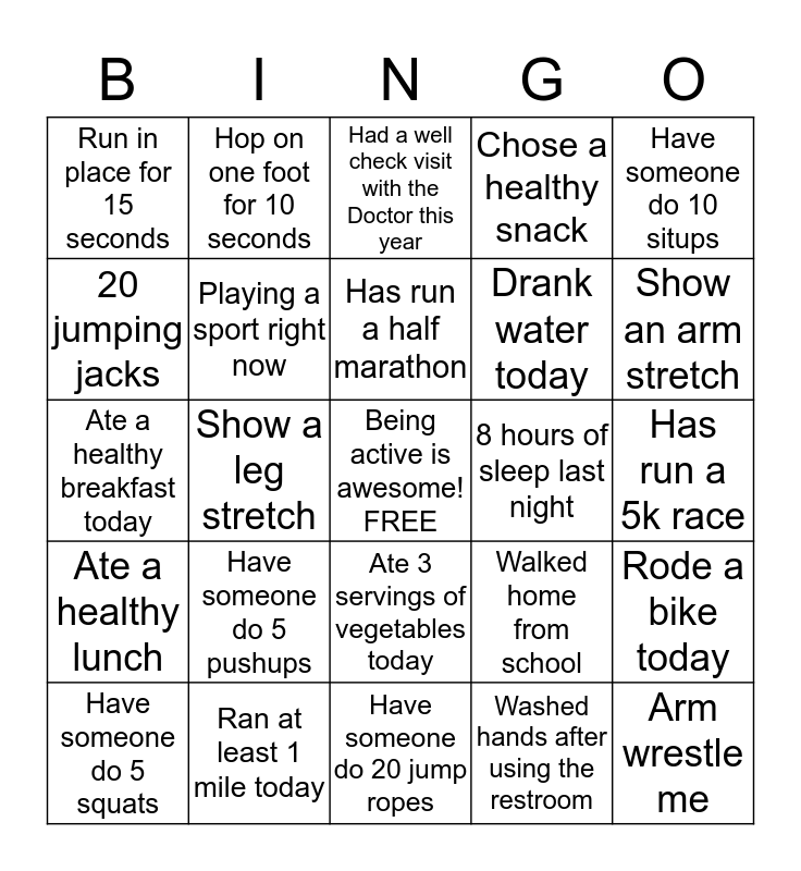 This bingo card has a free space and 24 words: Have someone do 5 pushups, Ran at least 1 mile today, Has run a half marathon, Have someone do 5 squats, Have someone do 10 situps, Run in place for 15 seconds, 20 jumping jacks, Hop on one foot for 10 seconds, 8 hours of sleep last night, Ate 3 servings of vegetables today, Drank water today, Ate a healthy breakfast today, Walked home from school, Rode a bike today, Playing a sport right now, Washed hands after using the restroom, Has run a 5k race, Had a well check visit with the Doctor this year, Show an arm stretch, Show a leg stretch, Arm wrestle me, Ate a healthy lunch, Chose a healthy snack and Have someone do 20 jump ropes.