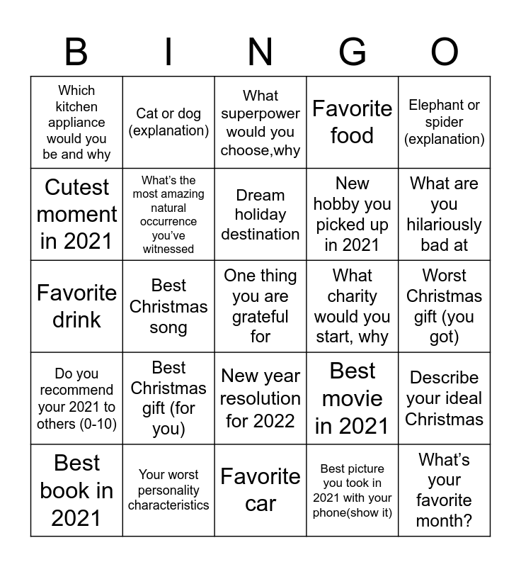 This bingo card has a free space and 24 words: Best Christmas gift (for you), Your worst personality characteristics, Dream holiday destination, Best book in 2021, Elephant or spider (explanation), Which kitchen appliance would you be and why, Cutest moment in 2021, Cat or dog (explanation), What charity would you start, why, New year resolution for 2022, New hobby you picked up in 2021, Favorite drink, Best movie in 2021, Describe your ideal Christmas, What’s the most amazing natural occurrence you’ve witnessed, Best picture you took in 2021 with your phone(show it), Worst Christmas gift (you got), What superpower would you choose,why, What are you hilariously bad at, Best Christmas song, What’s your favorite month?, Do you recommend your 2021 to others (0-10), Favorite food and Favorite car.