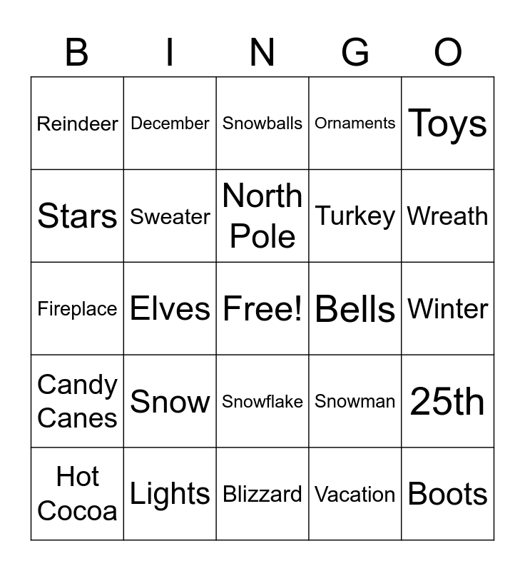 This bingo card has a free space and 24 words: Snow, Lights, North Pole, Hot Cocoa, Toys, Reindeer, Stars, December, Bells, Snowflake, Turkey, Fireplace, Snowman, 25th, Sweater, Vacation, Winter, Snowballs, Wreath, Elves, Boots, Candy Canes, Ornaments and Blizzard.
