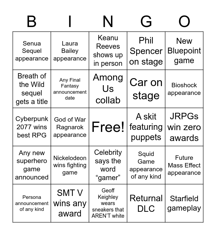 This bingo card has a free space and 24 words: Nickelodeon wins fighting game, SMT V wins any award, Among Us collab, Persona announcement of any kind, New Bluepoint game, Senua Sequel appearance, Breath of the Wild sequel gets a title, Laura Bailey appearance, A skit featuring puppets, Celebrity says the word “gamer”, Car on stage, Cyberpunk 2077 wins best RPG, Squid Game appearance of any kind, Future Mass Effect appearance, Any Final Fantasy announcement date, Returnal DLC, JRPGs win zero awards, Keanu Reeves shows up in person, Bioshock appearance, God of War Ragnarok appearance, Starfield gameplay, Any new superhero game announced, Phil Spencer on stage and Geoff Keighley wears sneakers that AREN’T white.