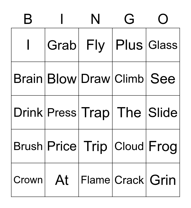 This bingo card has 25 words: Price, Flame, Draw, Crown, Glass, I, Brain, Grab, The, Trip, Climb, Drink, Cloud, Frog, Blow, Grin, Slide, Fly, See, Press, Trap, At, Brush, Plus and Crack.