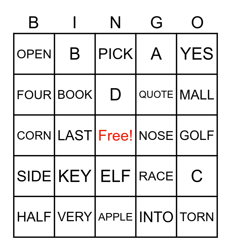 This bingo card has a free space and 29 words: HALF, UNDER, LAST, Drop, OPEN, PICK, BOOK, KEY, NOSE, VERY, GOLF, TORN, APPLE, INTO, MALL, JUMP, ELF, SIDE, YES, CORN, RACE, HAM, QUOTE, FOUR, A, B, C, D and E.