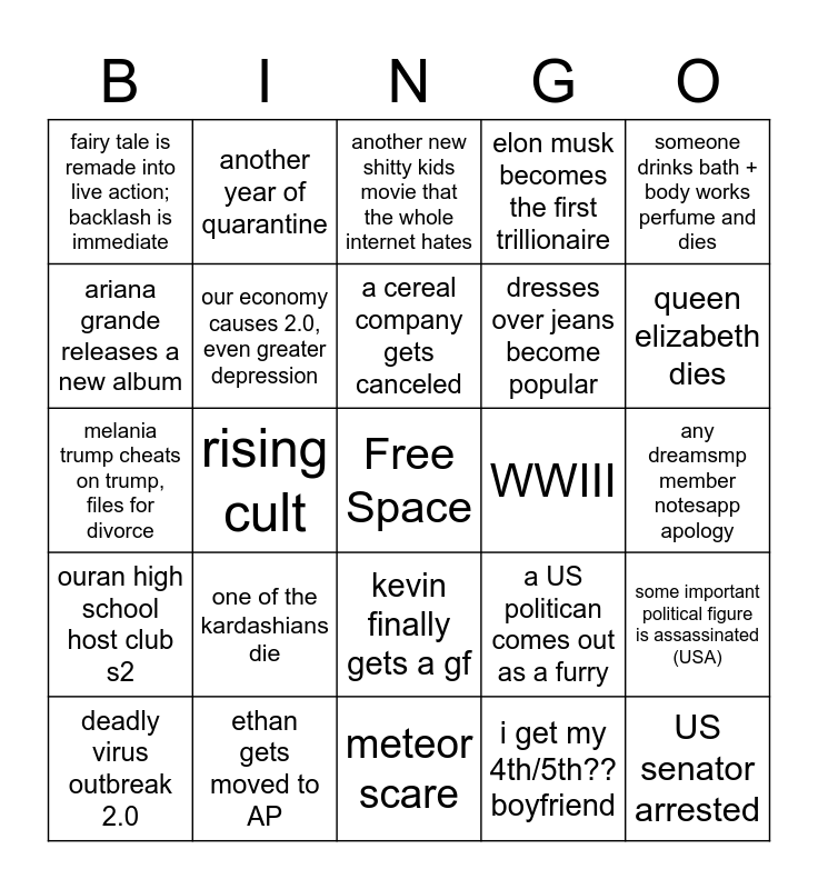 This bingo card has a free space and 24 words: one of the kardashians die, ethan gets moved to AP, a cereal company gets canceled, deadly virus outbreak 2.0, someone drinks bath + body works perfume and dies, fairy tale is remade into live action; backlash is immediate, ariana grande releases a new album, another year of quarantine, WWIII, kevin finally gets a gf, dresses over jeans become popular, melania trump cheats on trump, files for divorce, a US politican comes out as a furry, some important political figure is assassinated (USA), our economy causes 2.0, even greater depression, i get my 4th/5th?? boyfriend, any dreamsmp member notesapp apology, another new shitty kids movie that the whole internet hates, queen elizabeth dies, rising cult, US senator arrested, ouran high school host club s2, elon musk becomes the first trillionaire and meteor scare.
