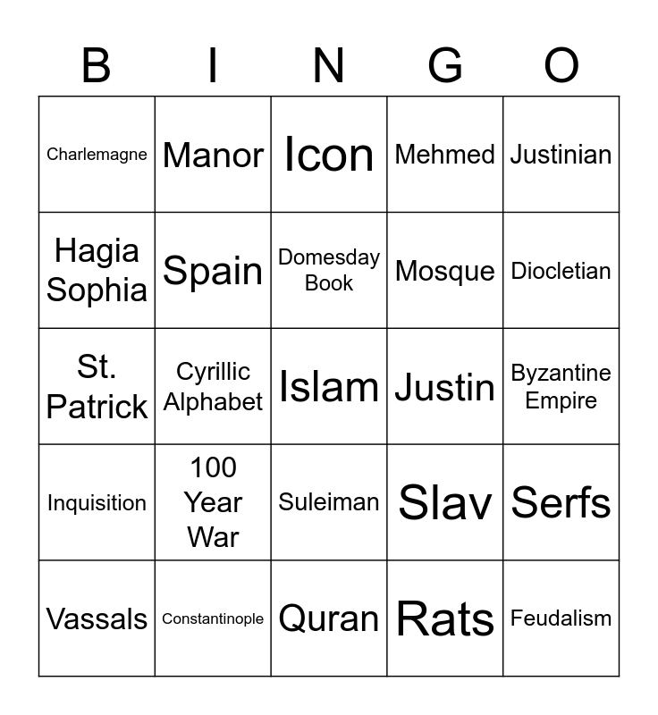 This bingo card has a free space and 24 words: 100 Year War, Constantinople, Domesday Book, Vassals, Justinian, Charlemagne, Hagia Sophia, Manor, Justin, Suleiman, Mosque, St. Patrick, Slav, Serfs, Spain, Rats, Byzantine Empire, Icon, Diocletian, Cyrillic Alphabet, Feudalism, Inquisition, Mehmed and Quran.