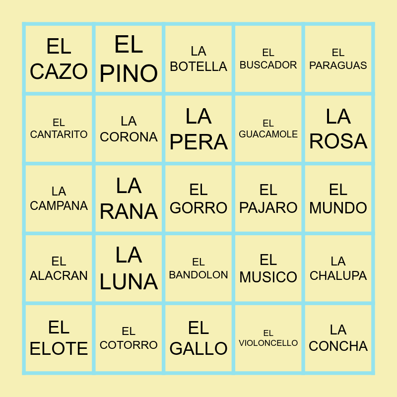 This bingo card has 54 words: EL AJOLOTE, EL ALACRAN, EL ARBOL, EL ARPA, EL BANDOLON, EL BARRIL, EL BUSCADOR, EL CAMARON, EL CANTARITO, EL CATRIN, EL CAZO, EL CORAZON, EL COTORRO, EL ELOTE, EL EMOJI, EL GALLO, EL GORRO, EL GUACAMOLE, EL MELON, EL MUNDO, EL MUSICO, EL NOPAL, EL PAJARO, EL PARAGUAS, EL PESCADO, EL PINO, EL SOL, EL TAMBOR, EL VENADO, EL VIOLONCELLO, EL XOLOITZCUINTLE, LA ARANA, LA BANDERA, LA BOTA, LA BOTELLA, LA CALAVERA, LA CAMPANA, LA CHALUPA, LA CONCHA, LA CORONA, LA DAMA, LA ESCALERA, LA ESTRELLA, LA GRAZA, LA LUNA, LA MACETA, LA MANO, LA PALMA, LA PERA, LA RANA, LA ROSA, LA SANDIA, LA SIRENA and LAS JARAS.