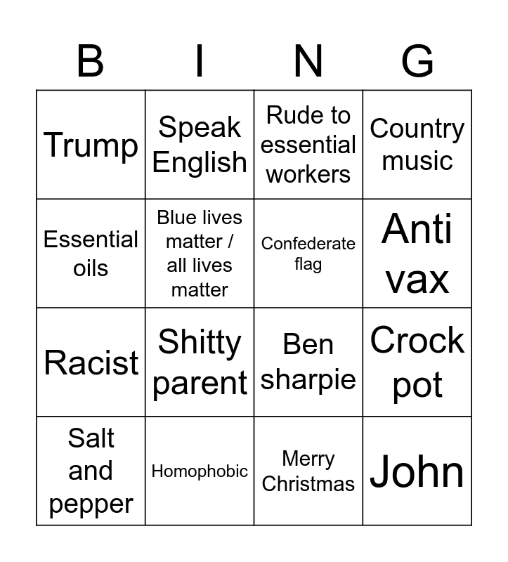 This bingo card has 25 words: Free!, Karen, Anti vax, Vaccine causes autism, Essential oils, Trump, Blue lives matter / all lives matter, Speak English, Homophobic, Transphobic, Racist, Ben sharpie, guns, hunting, Confederate flag, patriotism, Merry Christmas, Rude to essential workers, Shitty parent, Crock pot, Salt and pepper, American cheese, John, Country music and Big Trucks.