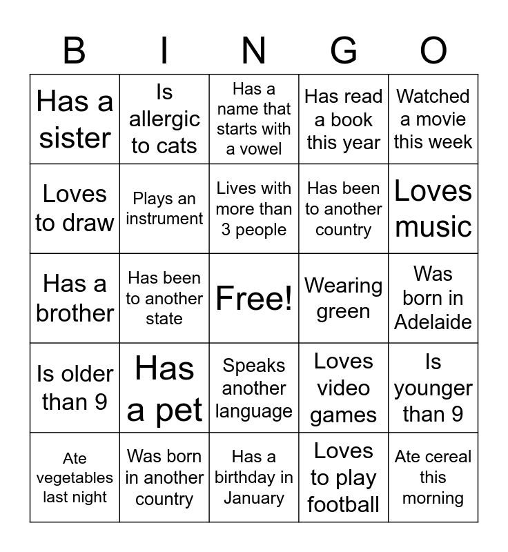 This bingo card has a free space and 24 words: Has a pet, Was born in another country, Lives with more than 3 people, Ate vegetables last night, Watched a movie this week, Has a sister, Loves to draw, Is allergic to cats, Wearing green, Speaks another language, Has been to another country, Has a brother, Loves video games, Is younger than 9, Plays an instrument, Loves to play football, Was born in Adelaide, Has a name that starts with a vowel, Loves music, Has been to another state, Ate cereal this morning, Is older than 9, Has read a book this year and Has a birthday in January.