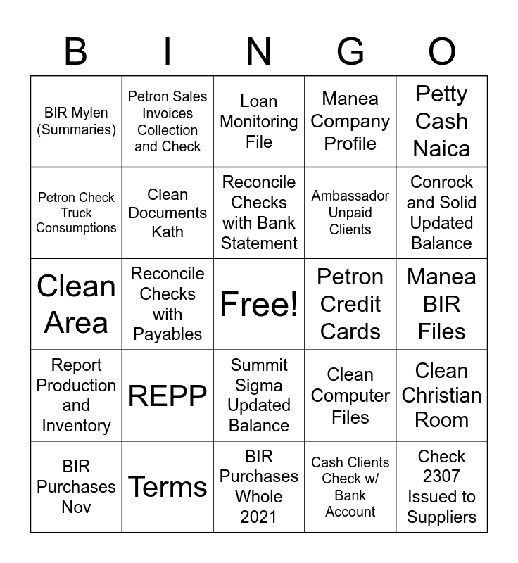 This bingo card has a free space and 24 words: REPP, Terms, Reconcile Checks with Bank Statement, BIR Purchases Nov, Petty Cash Naica, BIR Mylen (Summaries), Petron Check Truck Consumptions, Petron Sales Invoices Collection and Check, Petron Credit Cards, Summit Sigma Updated Balance, Ambassador Unpaid Clients, Clean Area, Clean Computer Files, Clean Christian Room, Clean Documents Kath, Cash Clients Check w/ Bank Account, Manea BIR Files, Loan Monitoring File, Conrock and Solid Updated Balance, Reconcile Checks with Payables, Check 2307 Issued to Suppliers, Report Production and Inventory, Manea Company Profile and BIR Purchases Whole 2021.