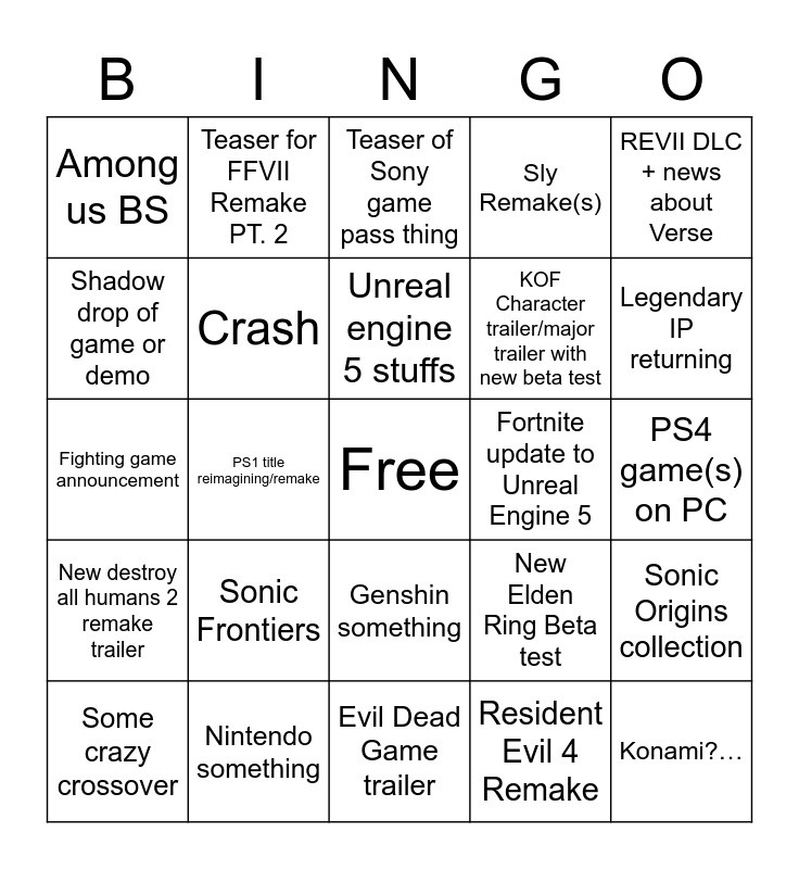 This bingo card has a free space and 24 words: Sonic Frontiers, Nintendo something, Unreal engine 5 stuffs, Some crazy crossover, REVII DLC + news about Verse, Among us BS, Shadow drop of game or demo, Teaser for FFVII Remake PT. 2, Fortnite update to Unreal Engine 5, Genshin something, KOF Character trailer/major trailer with new beta test, Fighting game announcement, New Elden Ring Beta test, Sonic Origins collection, Crash, Resident Evil 4 Remake, PS4 game(s) on PC, Teaser of Sony game pass thing, Legendary IP returning, PS1 title reimagining/remake, Konami?…, New destroy all humans 2 remake trailer, Sly Remake(s) and Evil Dead Game trailer.