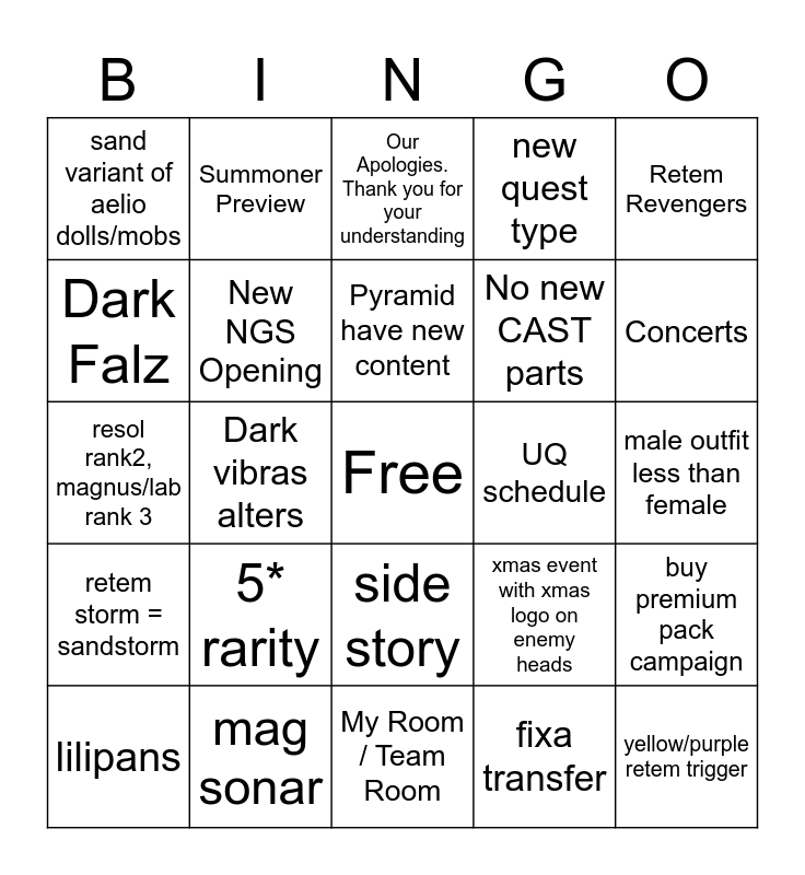 This bingo card has a free space and 24 words: 5* rarity, mag sonar, Pyramid have new content, lilipans, Retem Revengers, sand variant of aelio dolls/mobs, Dark Falz, Summoner Preview, UQ schedule, side story, No new CAST parts, resol rank2, magnus/lab rank 3, xmas event with xmas logo on enemy heads, buy premium pack campaign, New NGS Opening, fixa transfer, male outfit less than female, Our Apologies. Thank you for your understanding, Concerts, Dark vibras alters, yellow/purple retem trigger, retem storm = sandstorm, new quest type and My Room / Team Room.