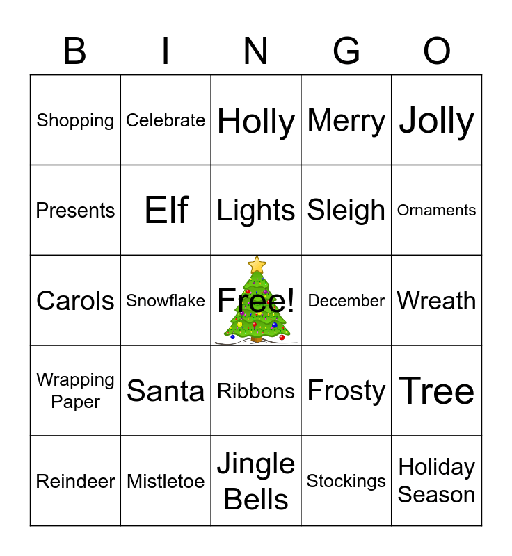 This bingo card has a free space and 24 words: Santa, Mistletoe, Lights, Reindeer, Jolly, Shopping, Presents, Celebrate, December, Ribbons, Sleigh, Carols, Frosty, Tree, Elf, Stockings, Wreath, Holly, Ornaments, Snowflake, Holiday Season, Wrapping Paper, Merry and Jingle Bells.