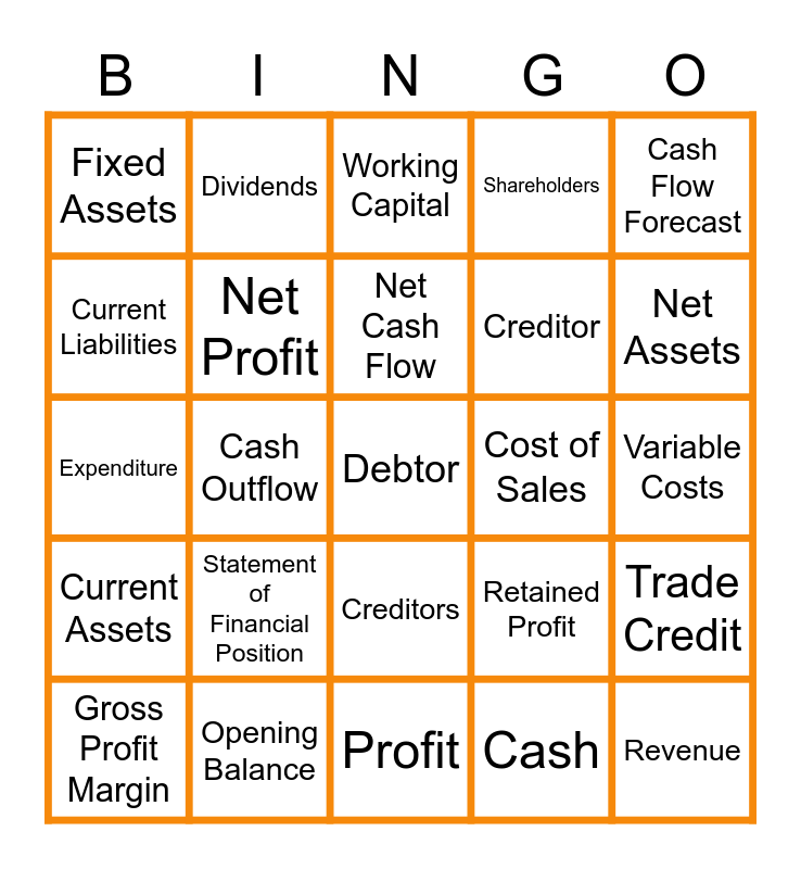 This bingo card has a free space and 24 words: Statement of Financial Position, Opening Balance, Net Cash Flow, Gross Profit Margin, Cash Flow Forecast, Fixed Assets, Current Liabilities, Dividends, Cost of Sales, Creditors, Creditor, Expenditure, Retained Profit, Trade Credit, Net Profit, Cash, Variable Costs, Working Capital, Net Assets, Cash Outflow, Revenue, Current Assets, Shareholders and Profit.