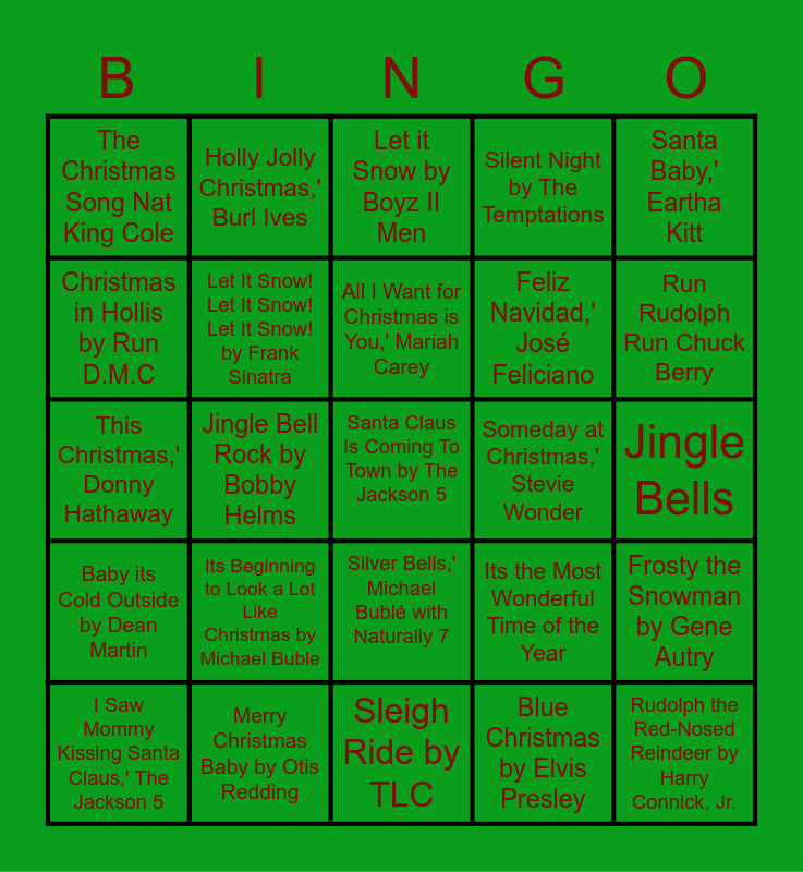This bingo card has a free space and 24 words: Its Beginning to Look a Lot Like Christmas by Michael Buble, Merry Christmas Baby by Otis Redding, All I Want for Christmas is You,' Mariah Carey, I Saw Mommy Kissing Santa Claus,' The Jackson 5, Santa Baby,' Eartha Kitt, The Christmas Song Nat King Cole, Christmas in Hollis by Run D.M.C, Holly Jolly Christmas,' Burl Ives, Someday at Christmas,' Stevie Wonder, Silver Bells,' Michael Bublé with Naturally 7, Feliz Navidad,' José Feliciano, This Christmas,' Donny Hathaway, Its the Most Wonderful Time of the Year, Frosty the Snowman by Gene Autry, Let It Snow! Let It Snow! Let It Snow! by Frank Sinatra, Blue Christmas by Elvis Presley, Jingle Bells, Let it Snow by Boyz II Men, Run Rudolph Run Chuck Berry, Jingle Bell Rock by Bobby Helms, Rudolph the Red-Nosed Reindeer by Harry Connick, Jr., Baby its Cold Outside by Dean Martin, Silent Night by The Temptations and Sleigh Ride by TLC.